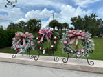 An 8" wreath (indoor only). This beautiful hand decorated wreath comes with a festive bow and shiny ornaments. The standard wreath is frosted. If you would like the traditional pine wreath please select pine in the space marked variant.